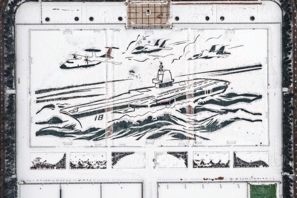 一个半小时后,线条硬朗、细节精准的航母图案在银装素裹的操场上清晰呈现:好一幅“雪舰踏浪,机跃云霄”的壮观画面!