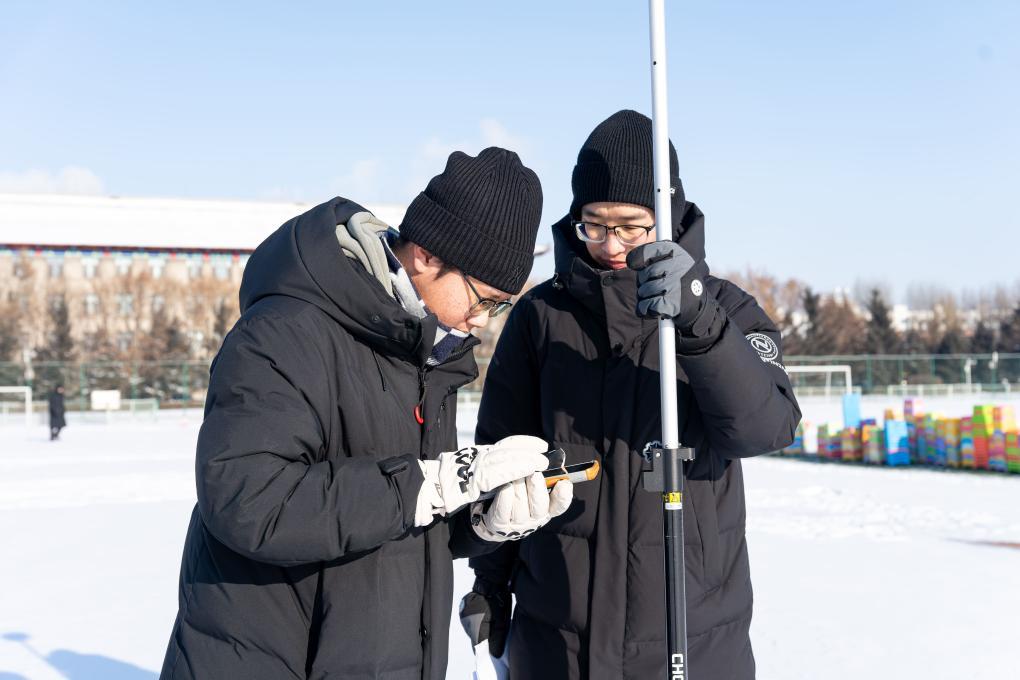 科技赋能是此次绘制“雪舰”的亮点。此次活动打点组负责人、哈工程2024级博士研究生王泽轩说,利用北斗实时差分定位技术,结合校内北斗移动观测系统,实现了厘米级的定位精度。10个打点小组将每一个特征点精准地“钉”在雪地上,为后续“施工”提供导航。