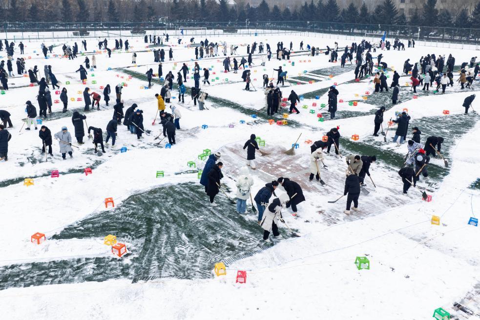 上午10时,依据预先划分的站位,师生们迅速投入“施工”。铁锹与操场的碰撞声,扫帚划过积雪的沙沙声,团队成员间的交流声,交织成极寒中的“劳动交响曲”。不少学生睫毛上挂着霜花,认真对照图纸清理积雪、修整轮廓。
