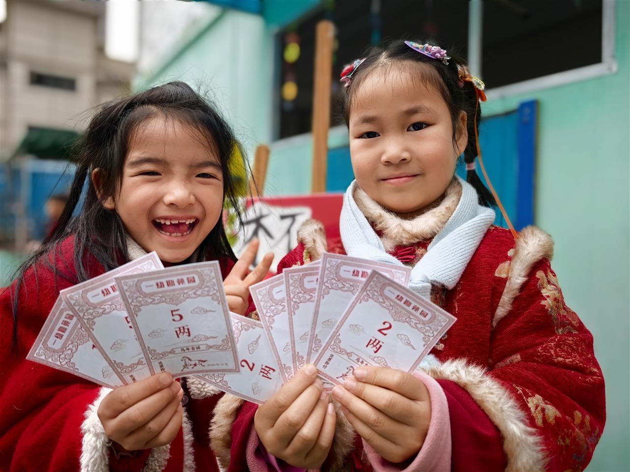“妈妈,你看我编的手环!老师说这个能赚3张银票呢!”小二班的陈敏蕊举着刚完成的“环环相扣”手环,蹦蹦跳跳地向妈妈炫耀。拿到属于自己的“劳动报酬”——银票时,孩子们的脸上都洋溢着自豪的笑容。不少孩子小心翼翼地把银票叠好放进小口袋,时不时拿出来数一数,盘算着要兑换的年货。