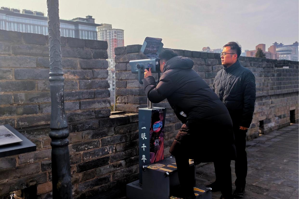 2026年1月5日,赵彬(右)在西安城墙上检查城墙的“一眼千年”AR望远镜设备。新华社发