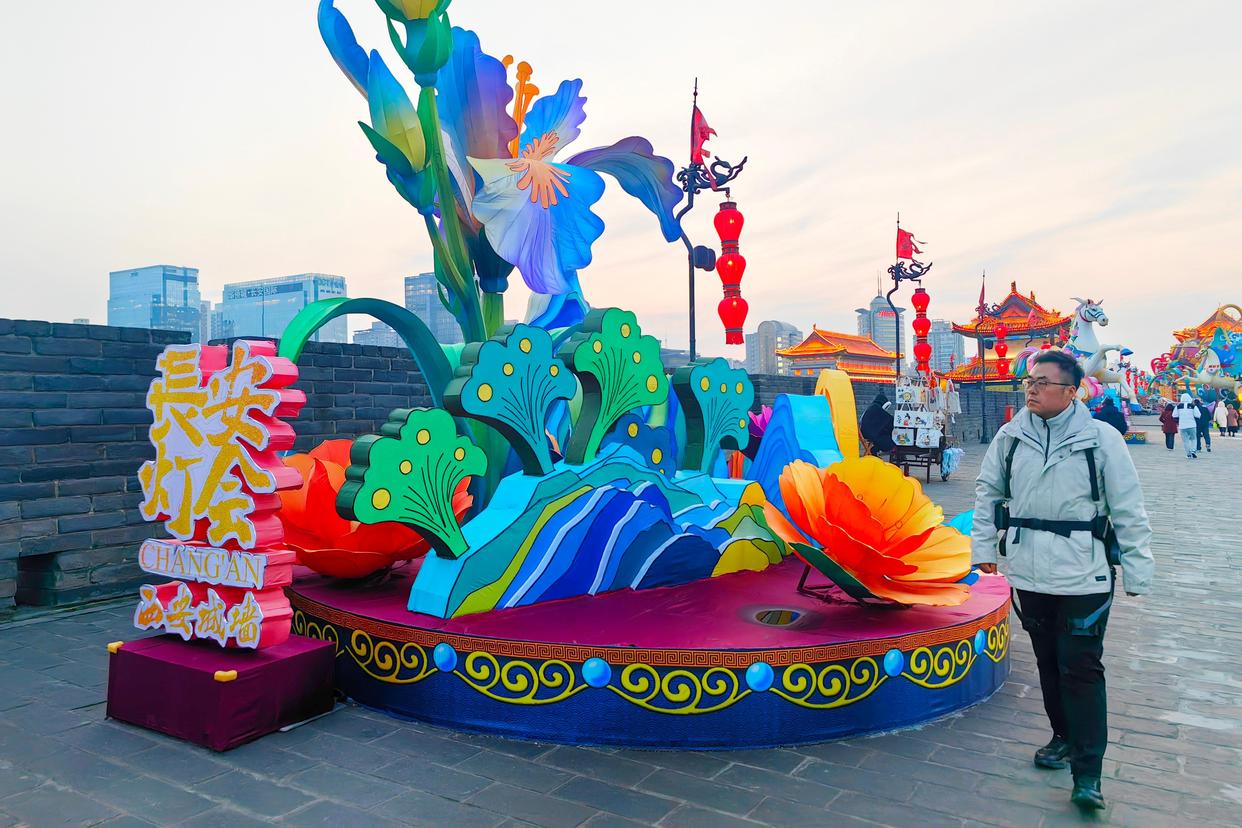 2026年1月4日,赵彬在西安城墙新年灯会期间带着城墙外骨骼机器人巡查。新华社发