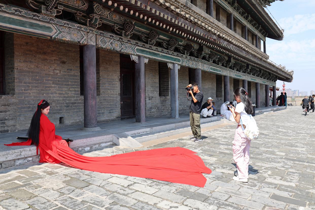 游客在西安城墙上拍摄艺术照(2025年9月12日摄)。新华社记者 朱唯希 摄