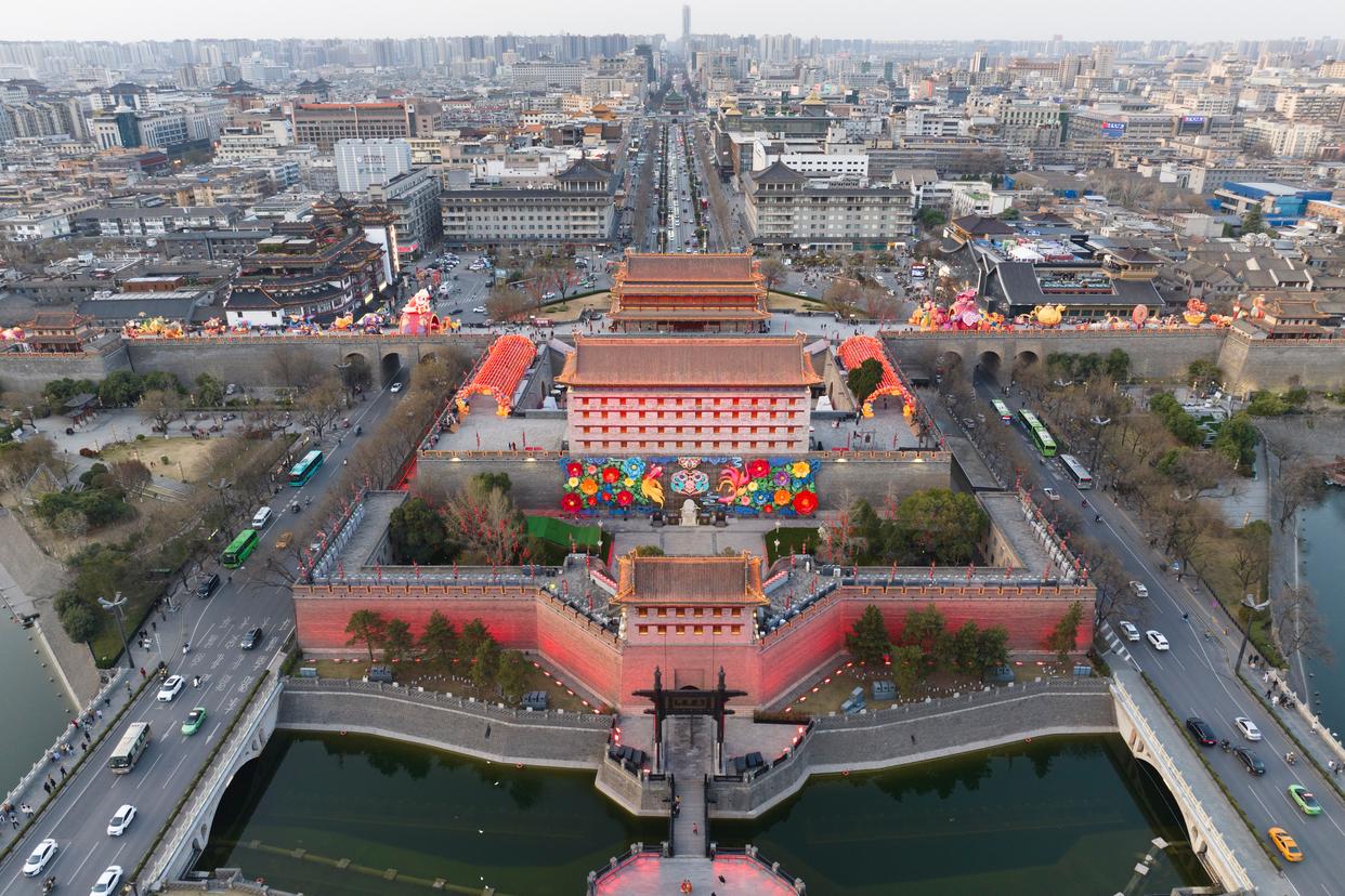 由南向北俯瞰西安城墙永宁门(2025年3月19日摄,无人机照片)。新华社记者 邵瑞 摄