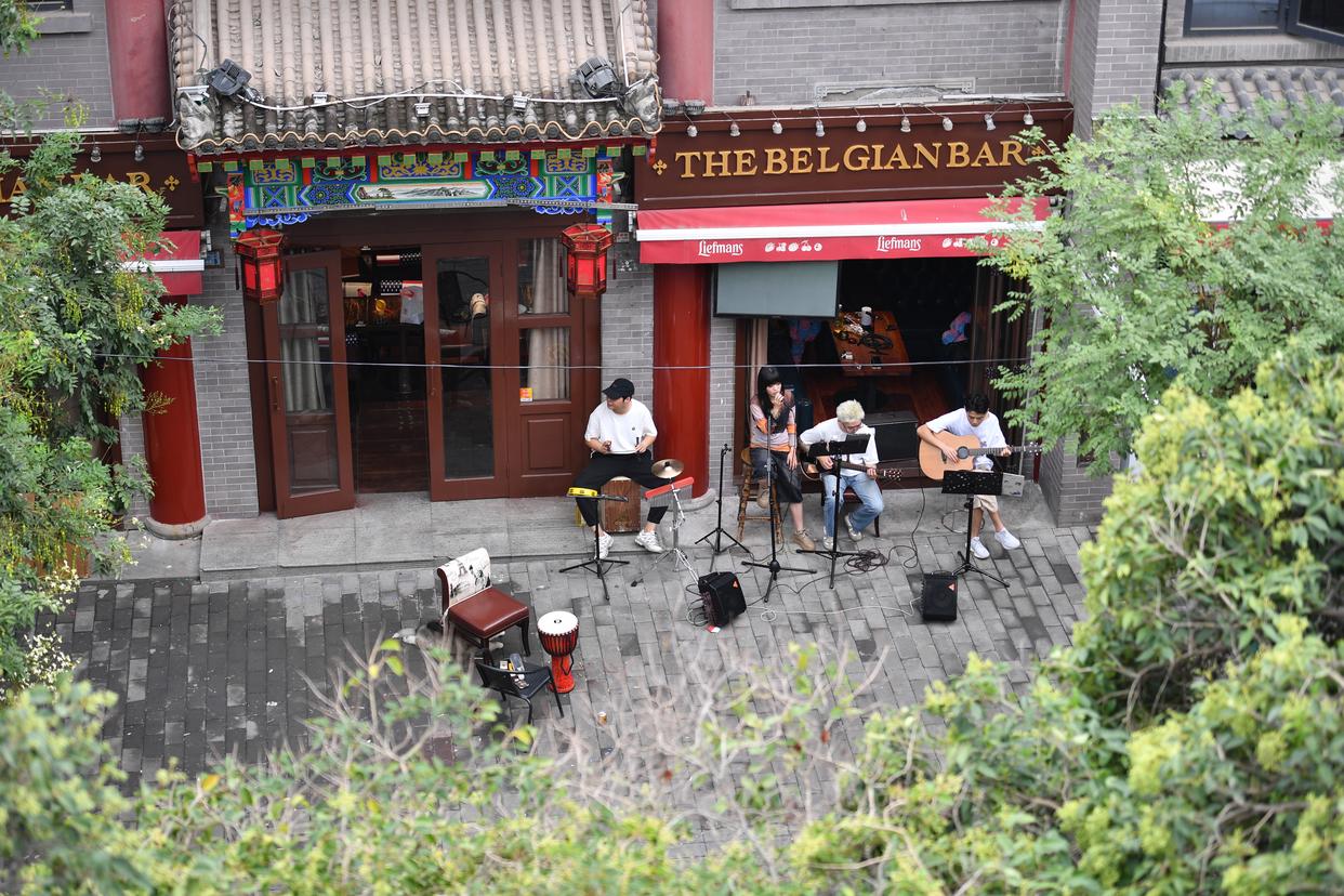 在西安城墙内侧顺城巷边的一家小店外,一支乐队在排练(2025年9月10日摄)。新华社记者 邵瑞 摄