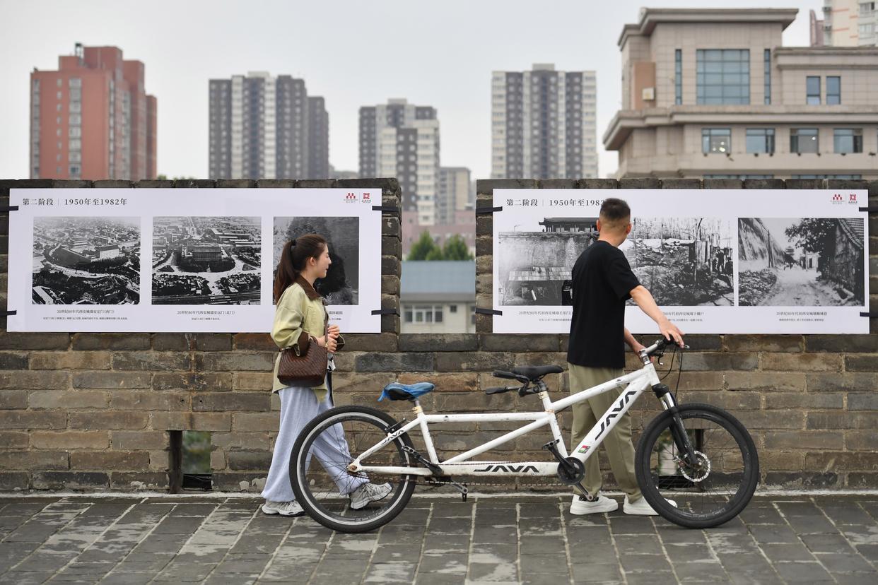 游客在西安城墙上参观以城墙保护为主题的图片展(2025年9月10日摄)。新华社记者 邵瑞 摄