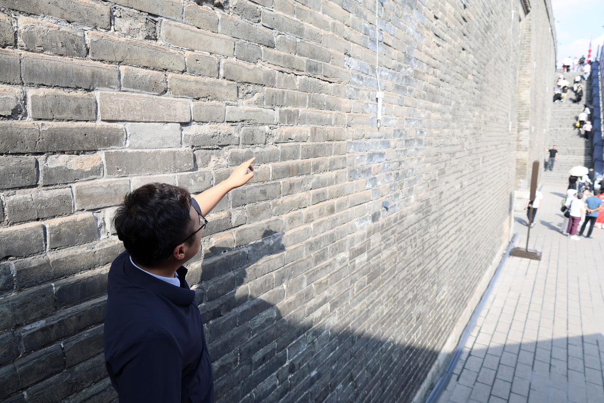 赵彬在介绍西安城墙永宁门上分布的传感监测设备的功能作用(2025年9月10日摄)。新华社记者 邵瑞 摄