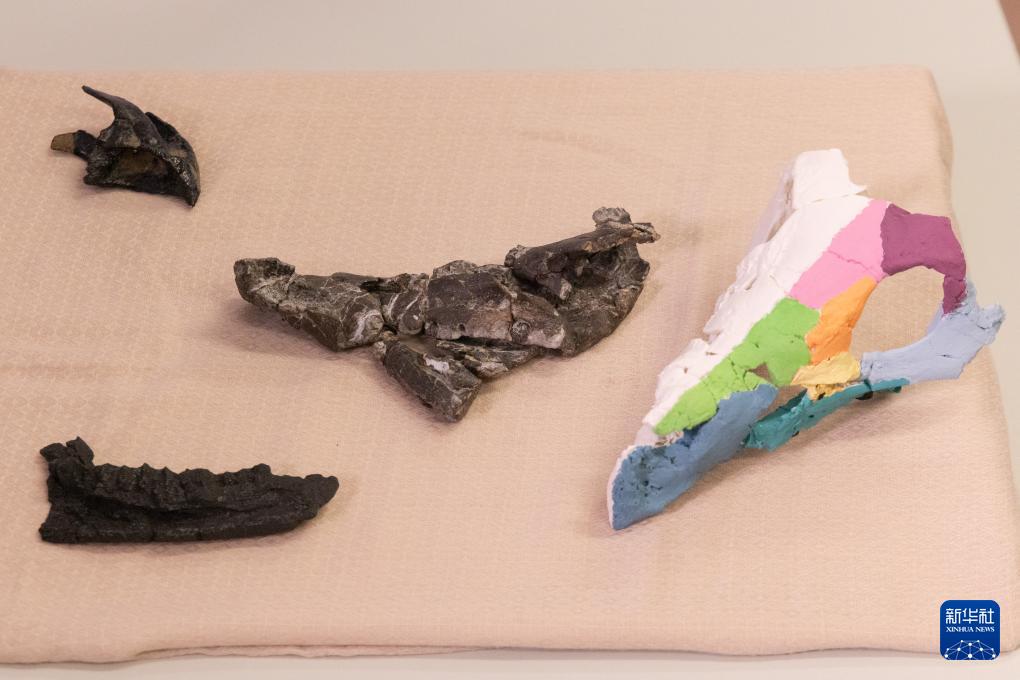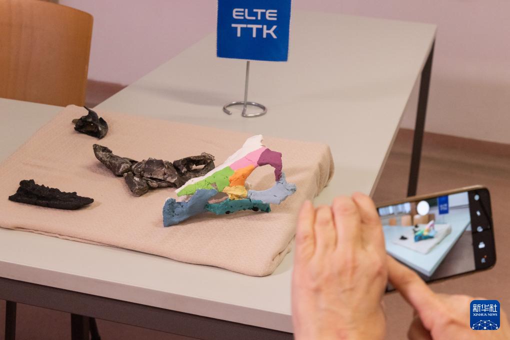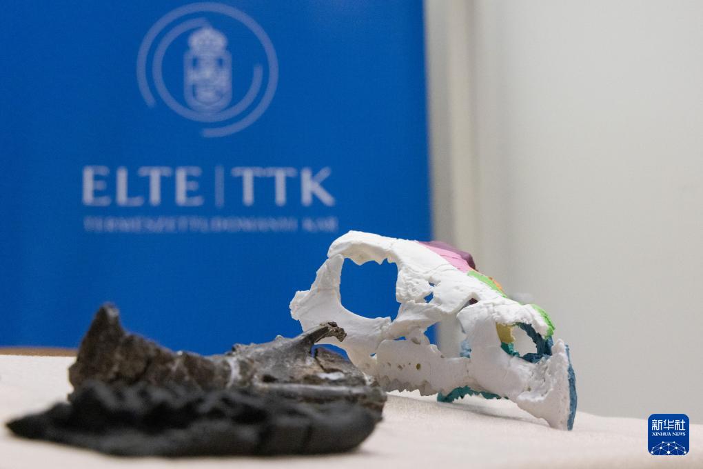 这是1月7日在匈牙利布达佩斯洛兰大学举行的新闻发布会上拍摄的科兹玛奥伊考角龙头骨化石及其3D复制模型。新华社发(弗尔季·奥蒂洛摄)
