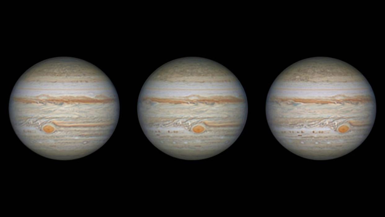 2022年9月27日木星冲日,这是9月26日在云南昆明拍摄的木星(拼版)。(梁长海 摄) 许长榕告诉记者,大红斑是木星上著名的反气旋风暴,已存在数百年,是其最显著的特征之一,常被视为木星的标志。