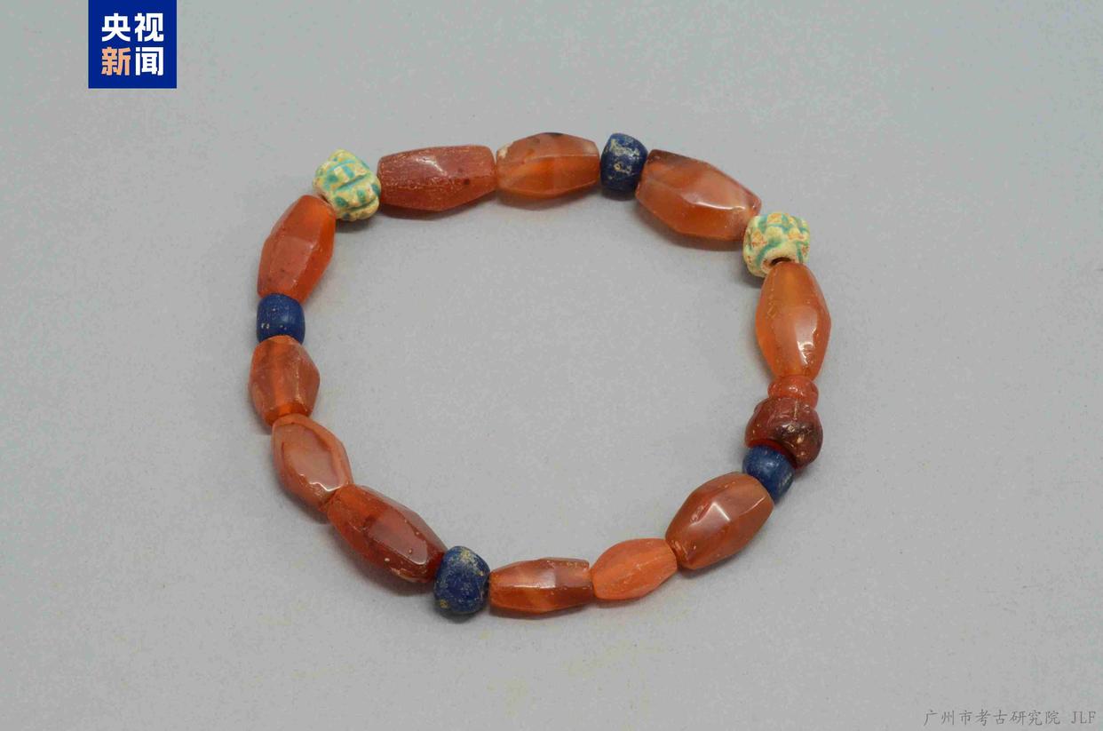 △东汉·费昂斯红玉髓玻璃珠串,广州市文物考古研究院(南汉二陵博物馆)藏。广州地区出土的费昂斯从成分、器形特点和时代特征来看,与埃及和西亚的相似,应是海路输入的舶来品。