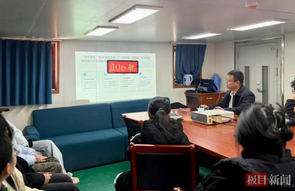 本次特色思政课全程于106舰开展,课堂阵地直接设在军舰内部会议室,让同学们在浸润式场景中感悟初心使命。课前同学们自主围绕106舰历史沿革、国防建设意义、青年使命担当等核心方向精心筹备PPT学习成果,在资料深挖与课件打磨中,提前筑牢对红色历史与家国大义的认知根基。王祖法说:“我们利用这样的一个授课方式可以提高学生的参与度,让他们可以参与到我们的思政课中来,更重要的是提高学生的眼界。”