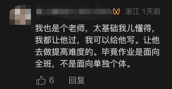 有老师在评论区留言说,一般老师布置的作业是面向全班,不是单独个体,“太基础我儿懂得,我都让他过,我可以给他写,让他去做提高难度的。”