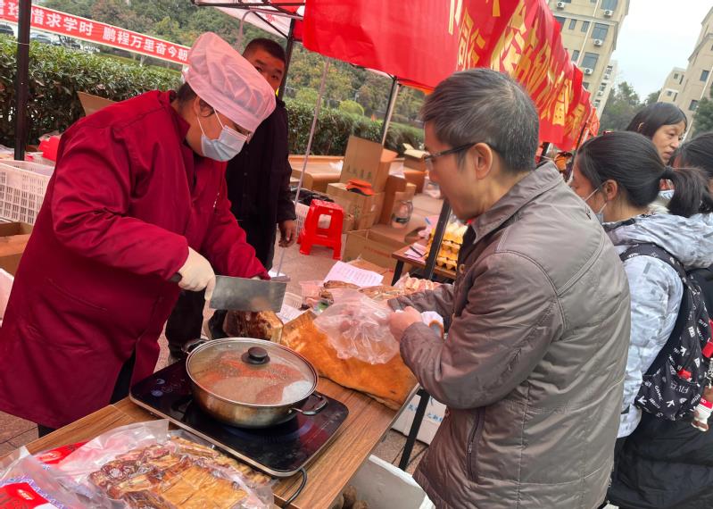 “这活动办得好,年味十足!”一位手提刚出锅的炸肉丸子、腊排骨的老师笑着称赞。活动现场,中商超市设置的美食加工点热气腾腾,炸肉丸、炸藕夹金黄酥脆,卤味香气扑鼻,新鲜分割的牛羊肉、土鸡野鸭等生鲜产品一应俱全。另一边,恩施梭布垭村的展台前更是热闹,恩施红绿茶、腊蹄子、腊排骨、羊肚菌、红薯粉、纯正蜂蜜等农副特产琳琅满目,引得师生们纷纷驻足挑选、询价采购。