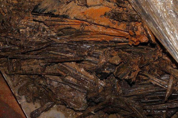 海昏侯墓出土的竹简在剥离前的样子(资料照片)。新华社发(江西省文物考古研究院供图)