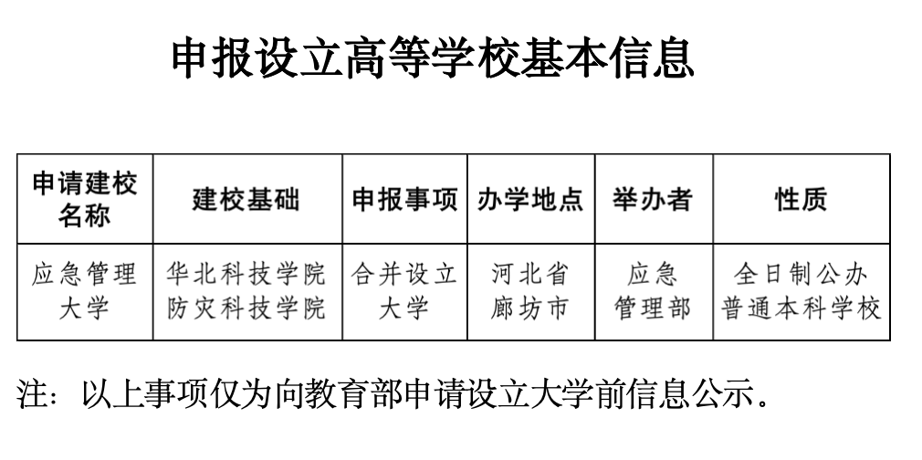 今年1月4日,教育部发布《关于拟同意设置本科高等学校的公示》,其中,拟同意华北科技学院、防灾科技学院更名为应急管理大学。