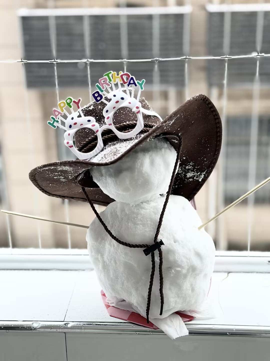 操场一隅的雪人创意展,更是将冬日的浪漫与温情推向极致。几个同学你一捧雪我一捧雪合力堆起的雪人憨态可掬。他们用红笔在雪人胸前认真写下“周冬梅老师天下第一师”,一笔一画都藏着藏不住的崇敬与喜爱,简单的文字成为雪地里最动人的告白。不远处,另一座雪人前插着一张彩色的“生日快乐”标签,雪人头顶还歪歪扭扭地戴着一顶毛线帽,这是同学们特意为当天过生日的同伴准备的惊喜。洁白的雪人既承载着最纯粹的同窗情谊,让这个雪天的生日格外有意义,也定格了校园里最温暖的瞬间。