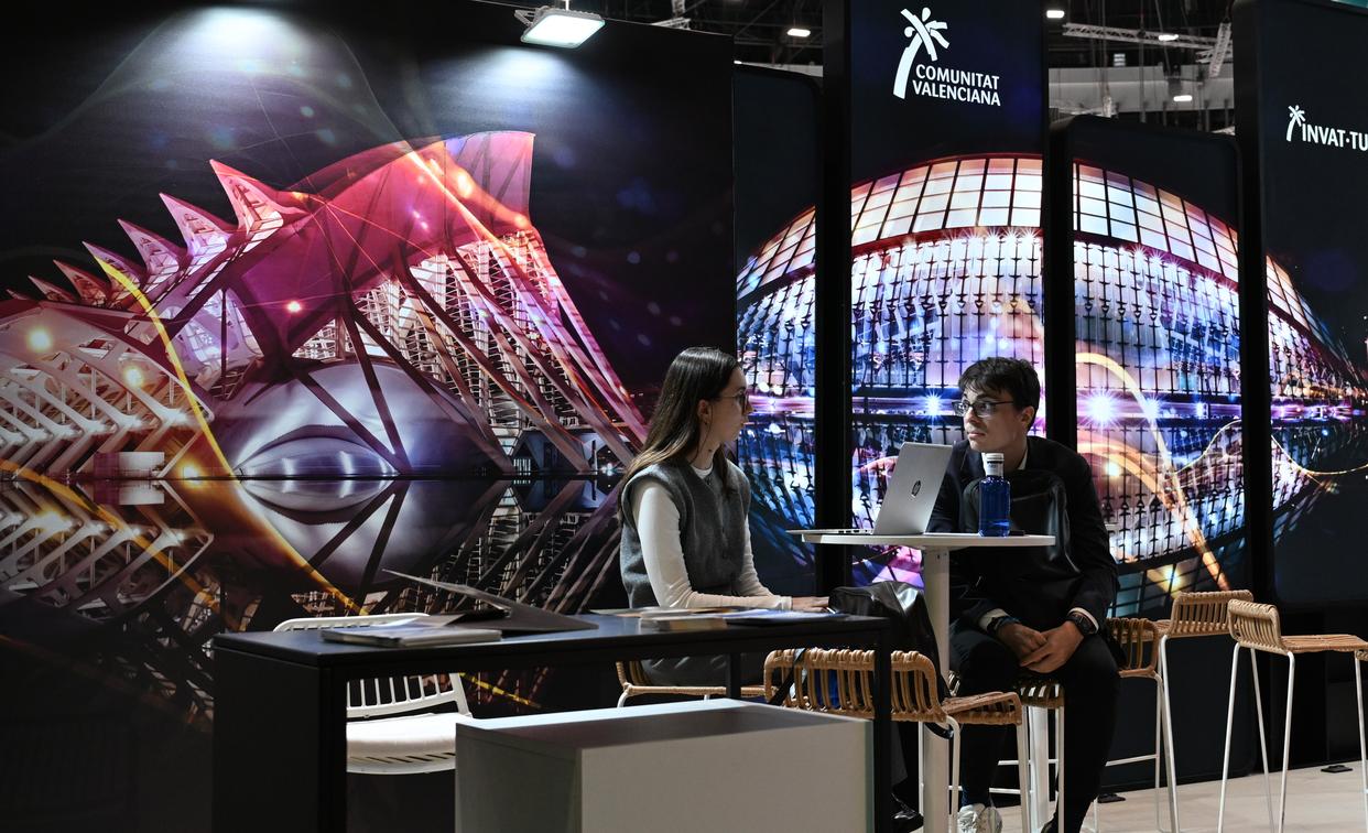 1月21日,在西班牙马德里,参展人士在旅游展上洽谈。新华社记者 程敏 摄