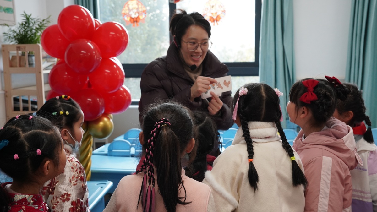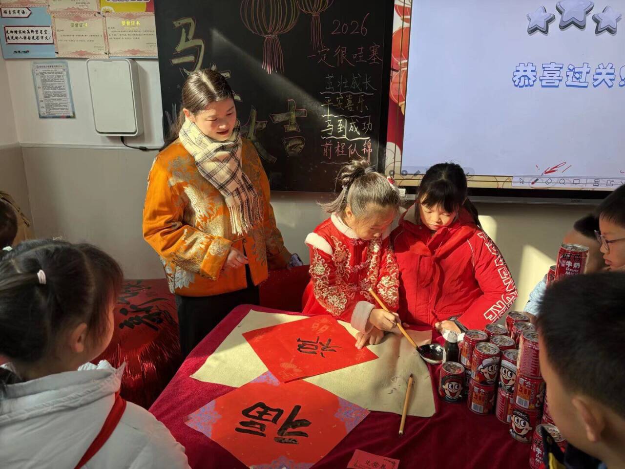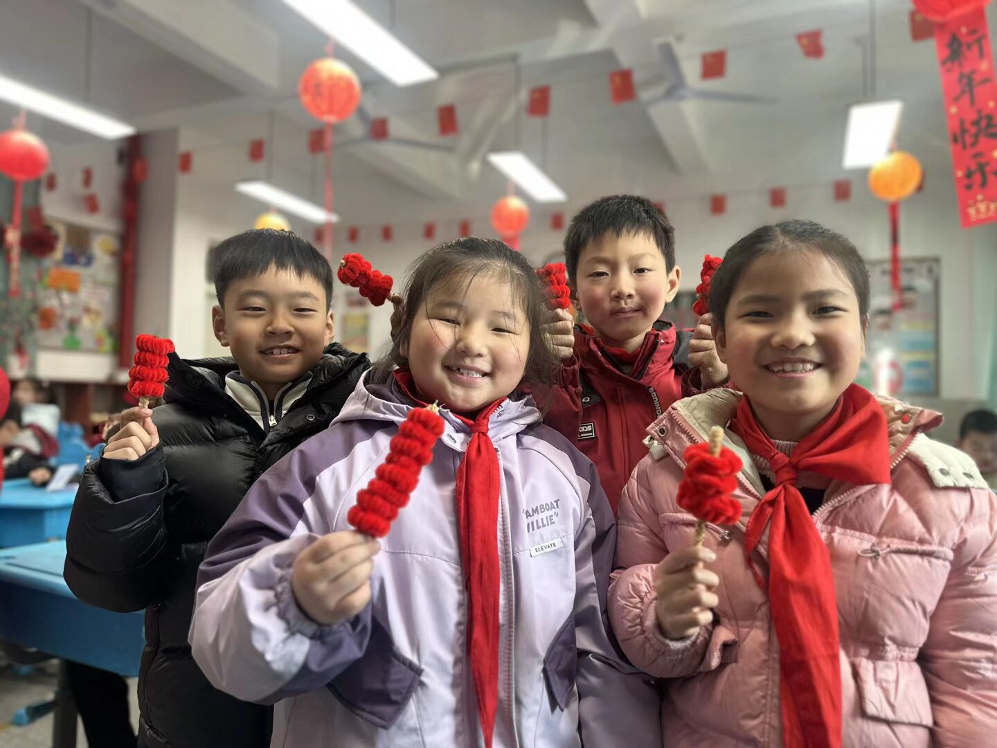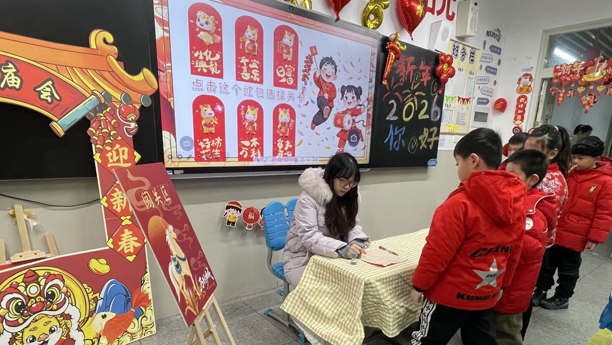 1月23日,农历腊月初五,武汉光谷第五小学(下文简称“光谷五小”)二年级教室被装点成红火的“新春庙会”,学生们身着红色年服,手持闯关卡,在“糖葫芦词语串串乐”“口算鞭炮响”“福字辨方向”等八个关卡间穿梭,每过一关就能获得一章认证。