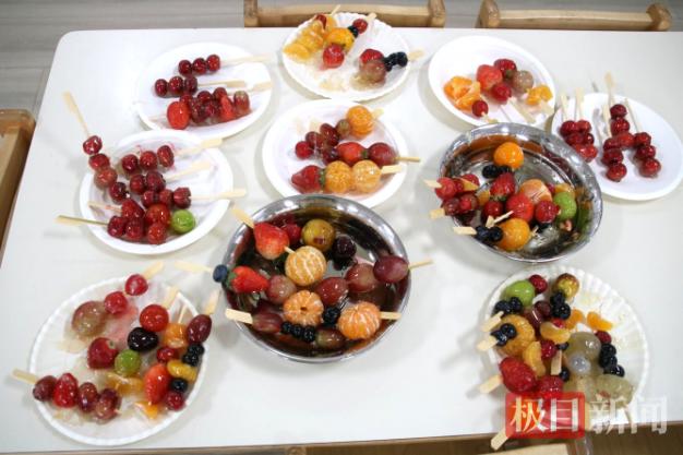 熬糖环节成为整场活动的“重头戏”。当透明的冰糖在锅中渐渐溶解,慢慢变成琥珀色的糖浆,咕嘟咕嘟冒着细密的泡泡时,孩子们纷纷围在锅边,睁着好奇的大眼睛,不时发出阵阵惊叹:“变成金黄色了!”“好香啊!”“现在可以挂糖衣了吗?”在老师的专业操作和帮助下,一串串水果串缓缓裹上晶莹剔透的糖衣,瞬间变得亮晶晶、甜蜜蜜,诱人的香气弥漫了整个教室。