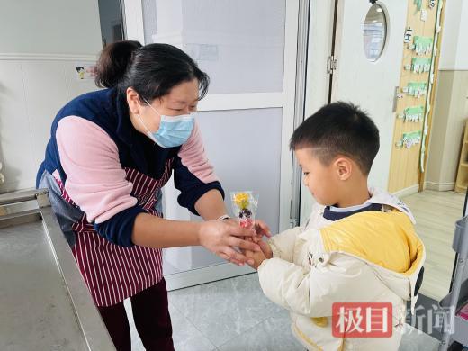 制作完成后,迎来了最温暖的分享环节。孩子们小心翼翼地将包装好的糖葫芦,亲手送到每天陪伴他们成长的老师、食堂厨师和保安叔叔阿姨手中,用稚嫩的声音说道:“老师,您辛苦啦,尝尝我做的糖葫芦,新年快乐!”一句句真诚的问候,一份份甜蜜的礼物,温暖了在场每一位工作人员的心。大家接过糖葫芦,细细品尝,脸上洋溢着幸福的笑容。