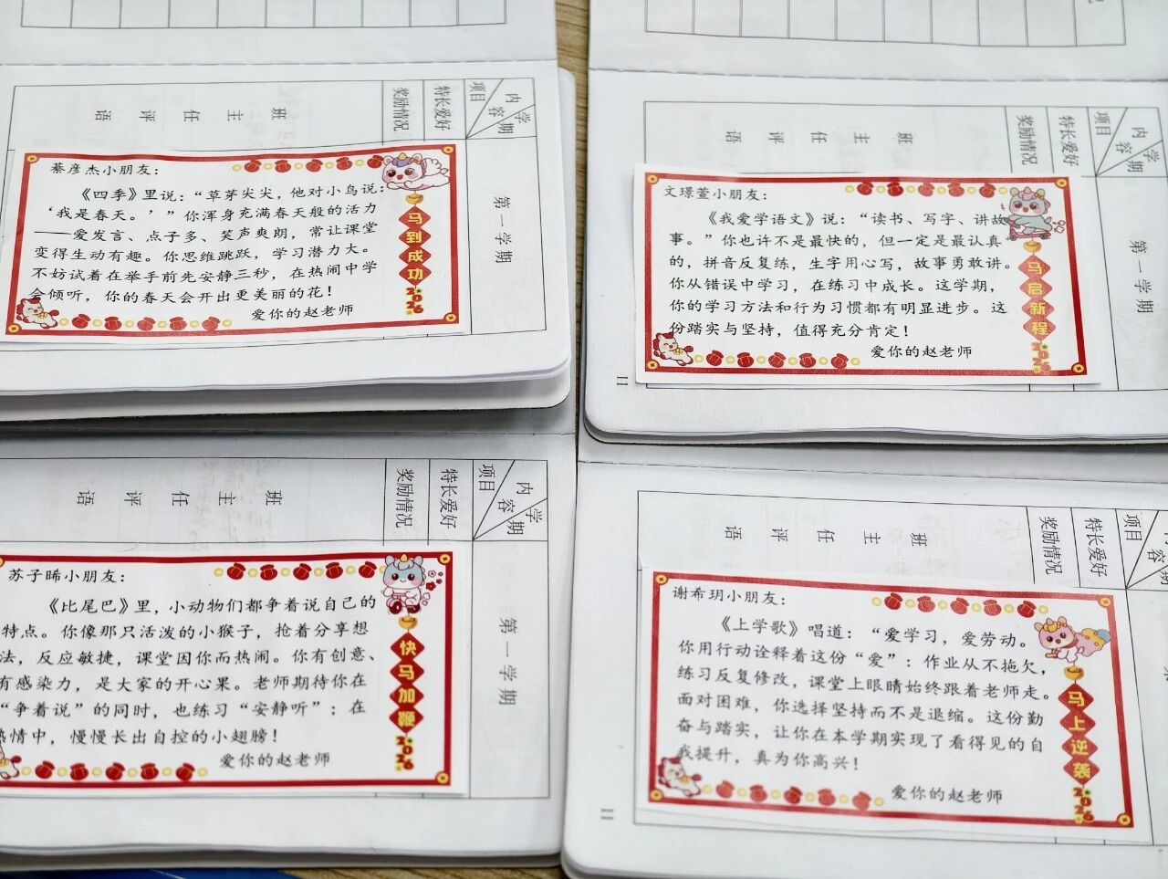 大赛之前,学校举行了“笔尖传情 评语育人”圆桌派,班主任们分组进行头脑风暴,碰撞灵感。杨诗婕老师说,可以把评语画出来、藏起来,变成“简笔画+解谜卡片”的模样,孩子们能边玩边读。陈亚红老师说,通过建“个性标签库”、画“成长轨迹图”,融入班级文化,可以把评语变成每个学生的“成长微纪录片”。还有很多老师提出,可以写专属藏头诗,设计“成长超能力”徽章,或手绘小马送祝福。