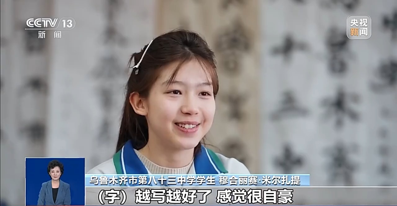乌鲁木齐市第八十三中学学生 穆合丽赛·米尔扎提:书法课感觉就很喜欢,越写越好了,感觉很自豪。