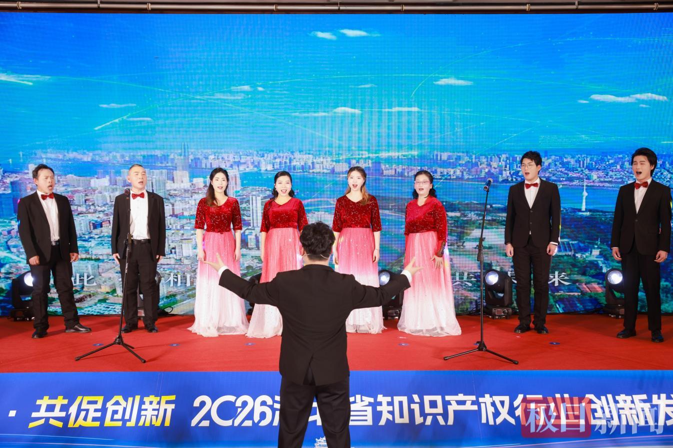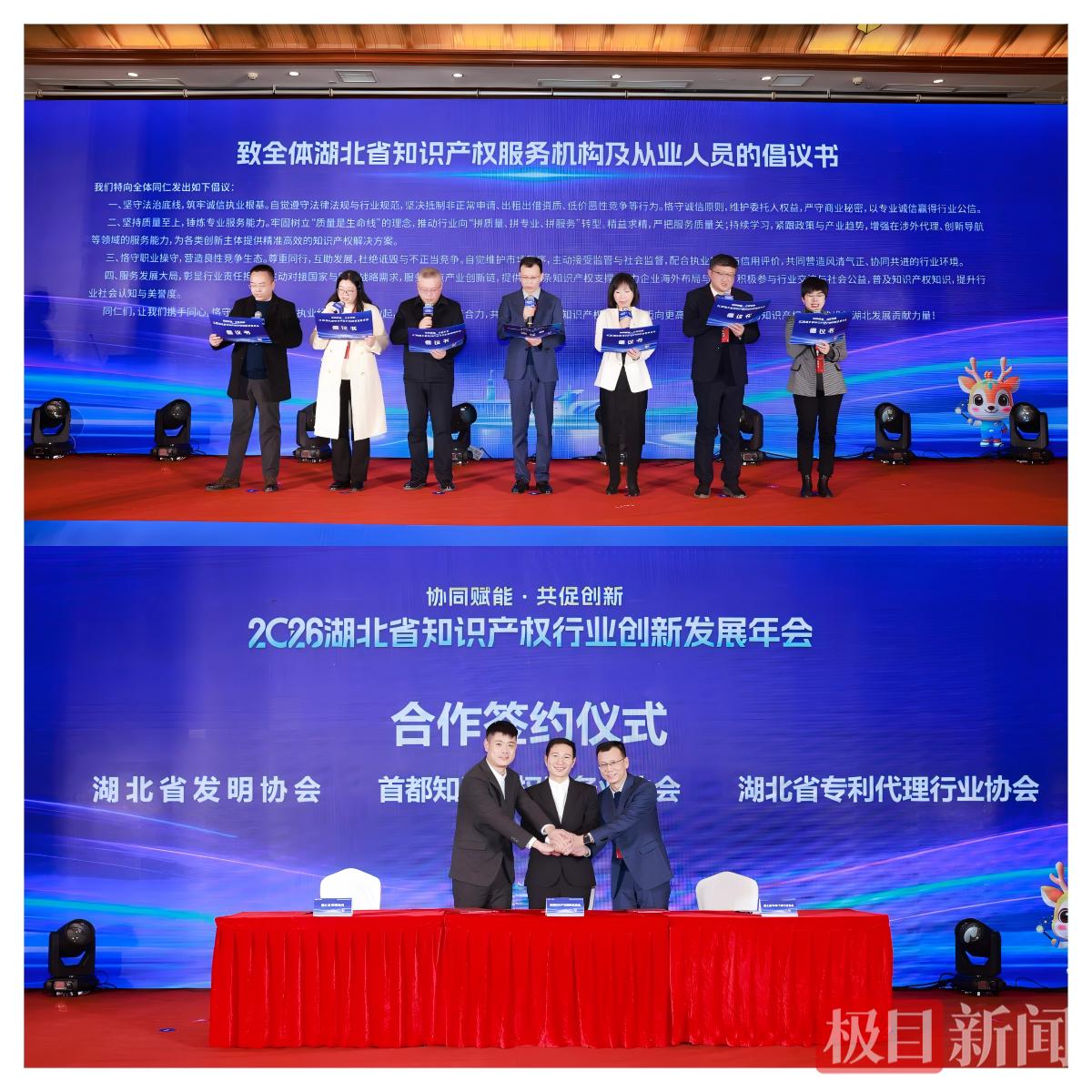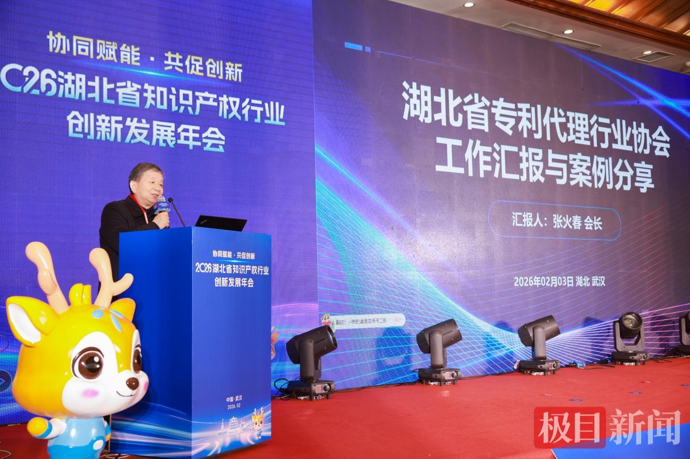 活动现场亮点纷呈。创新主体代表合唱知识产权主题原创歌曲《赋予》;省发明协会会长解孝林教授、省专利代理行业协会会长张火春分别介绍年度工作、分享服务案例;武汉市江岸区鄱阳街小学李心轶同学以讲故事形式,分享《农田守护天使——一种智能驱鸟系统装置》创新实践;第二届湖北专利奖金奖获奖单位分享研发及知识产权管理经验;省发明协会和省专利代理行业协会分别与首都知识产权协会签署战略合作协议,引入北京先进理念与优质资源;两家行业协会联合宣读倡议书,重点倡导行业自律、坚守优质优价导向,引导全行业规范发展;政产学研服各方共同点燃“创新火炬”,发布年度主题并启动2026年湖北省“小小发明家”活动,彰显创新不息的理念。