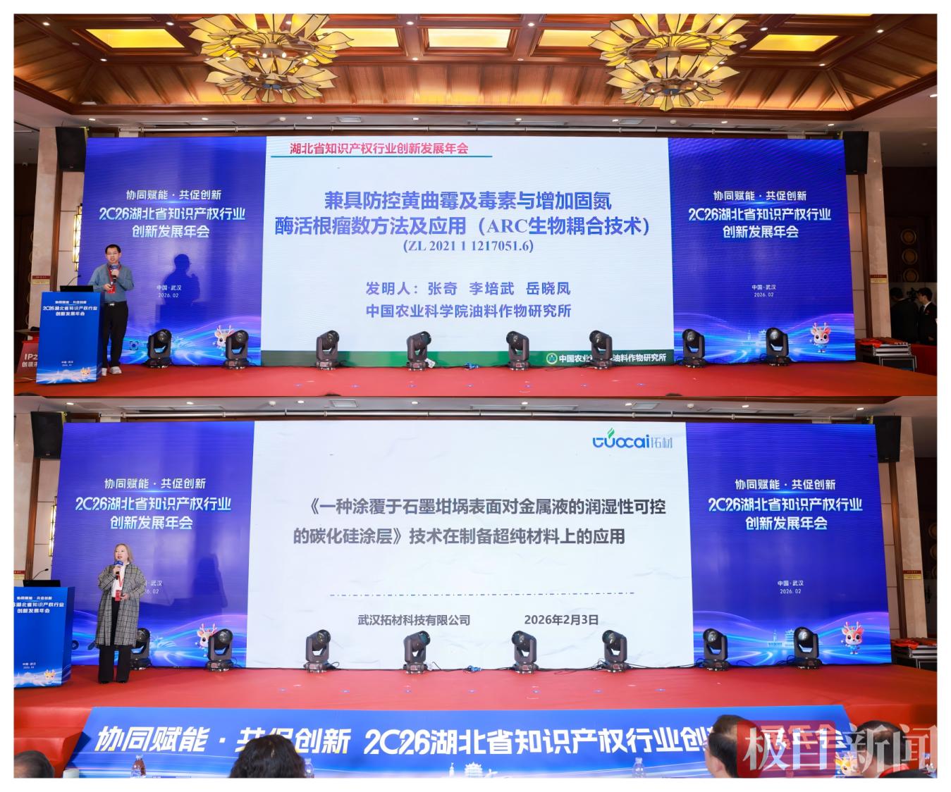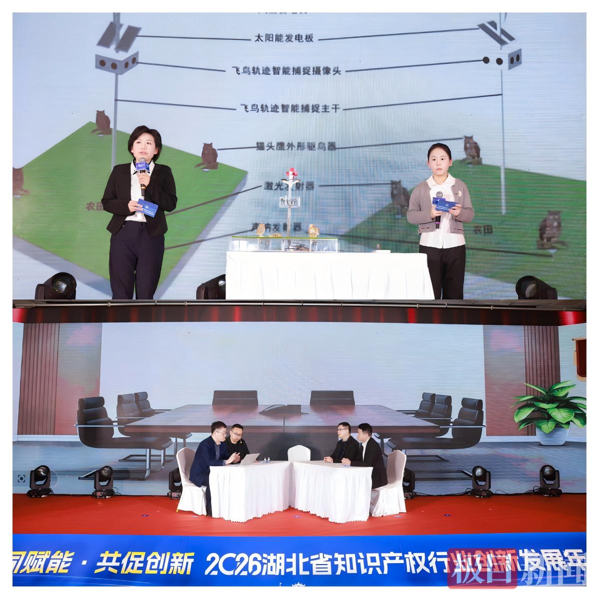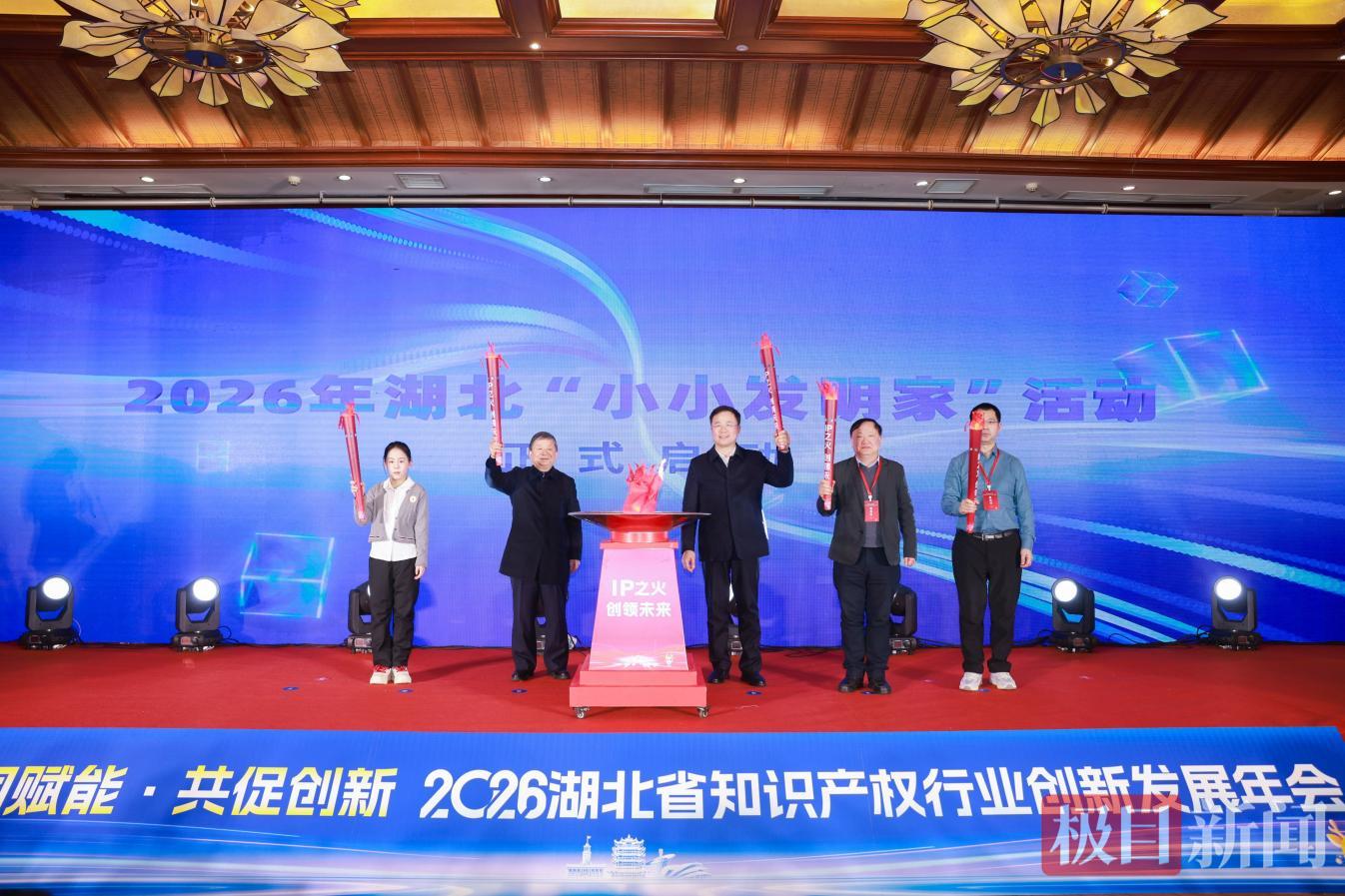 活动现场亮点纷呈。创新主体代表合唱知识产权主题原创歌曲《赋予》;省发明协会会长解孝林教授、省专利代理行业协会会长张火春分别介绍年度工作、分享服务案例;武汉市江岸区鄱阳街小学李心轶同学以讲故事形式,分享《农田守护天使——一种智能驱鸟系统装置》创新实践;第二届湖北专利奖金奖获奖单位分享研发及知识产权管理经验;省发明协会和省专利代理行业协会分别与首都知识产权协会签署战略合作协议,引入北京先进理念与优质资源;两家行业协会联合宣读倡议书,重点倡导行业自律、坚守优质优价导向,引导全行业规范发展;政产学研服各方共同点燃“创新火炬”,发布年度主题并启动2026年湖北省“小小发明家”活动,彰显创新不息的理念。