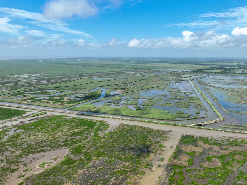 俯瞰上海崇明东滩鸟类国家级自然保护区(2024年7月24日摄,无人机照片)。