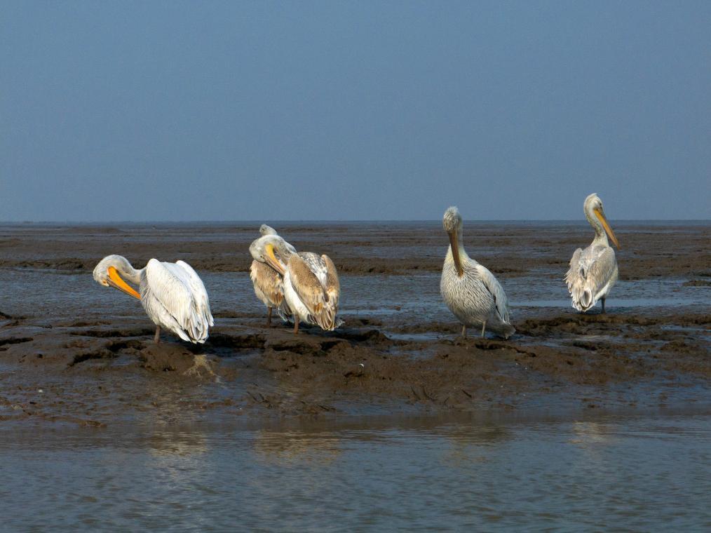 卷羽鹈鹕在上海崇明东滩鸟类国家级自然保护区栖息(2024年12月26日摄)。