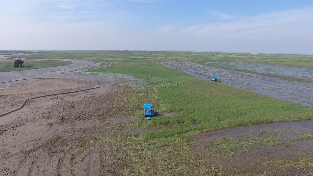 互花米草刈割场景(2016年7月4日摄,无人机照片)。