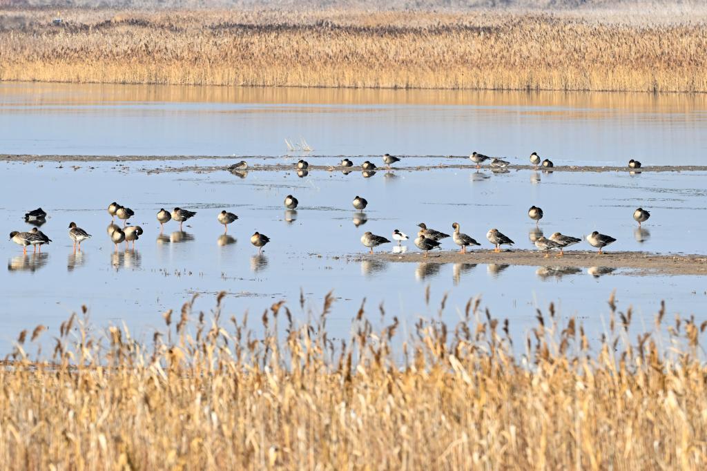 候鸟在上海崇明东滩鸟类国家级自然保护区栖息(1月23日摄)。