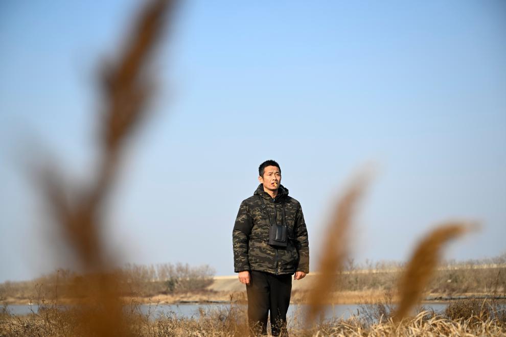 金伟国徒弟尹洪超在上海崇明东滩鸟类国家级自然保护区观察候鸟。(2026年1月23日摄)。