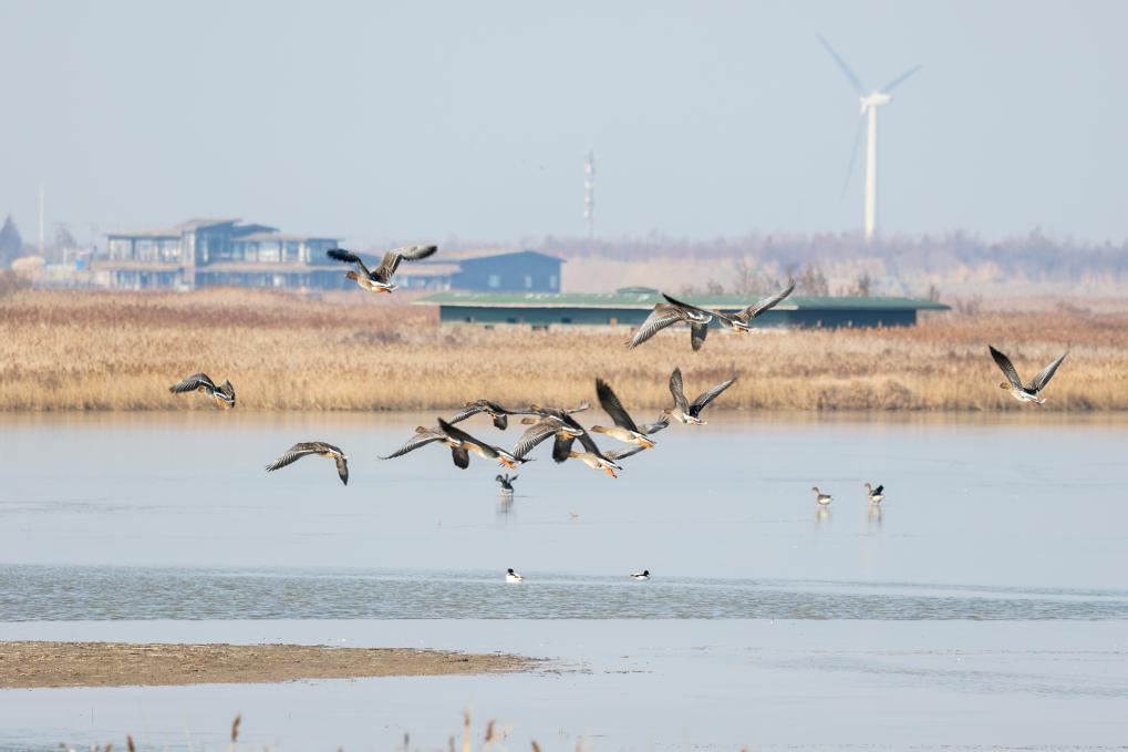 候鸟在上海崇明东滩鸟类国家级自然保护区飞翔(1月23日摄)。