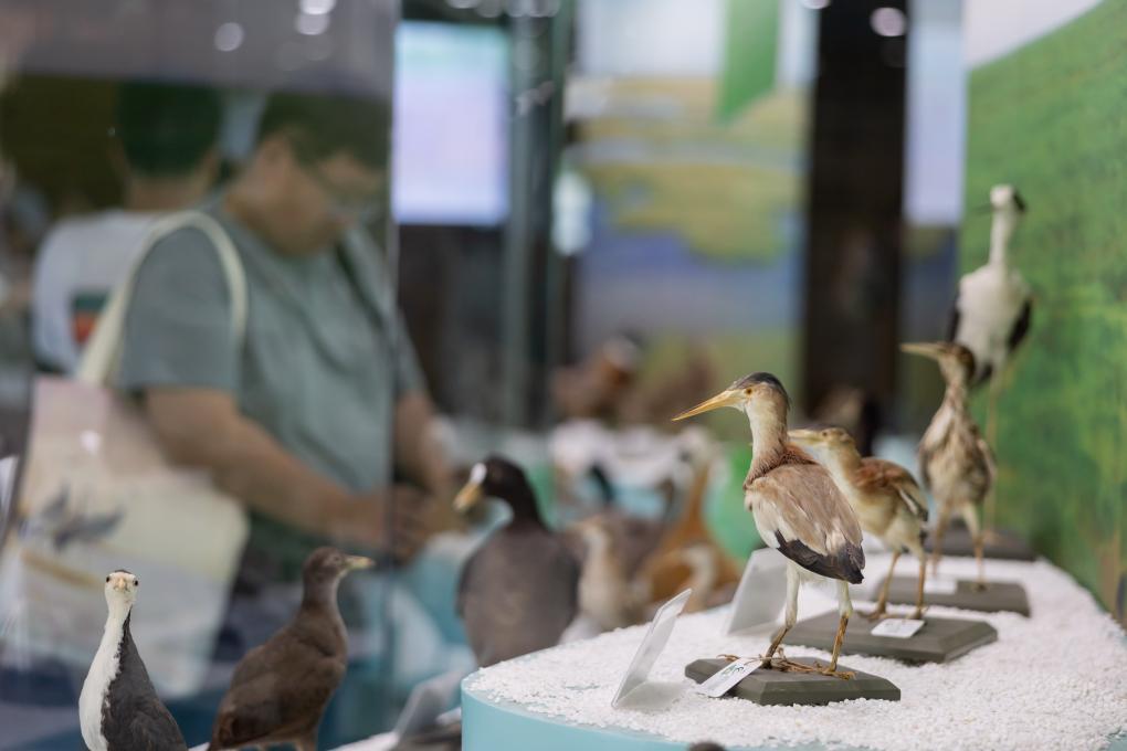 这是陈列在上海崇明东滩鸟类国家级自然保护区科普教育基地展馆内的鸟类标本(2024年7月24日摄)。