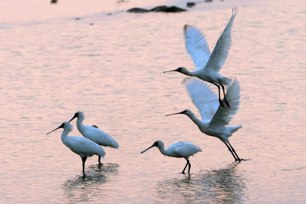 黑脸琵鹭在上海崇明东滩鸟类国家级自然保护区栖息(2023年5月14日摄)。
