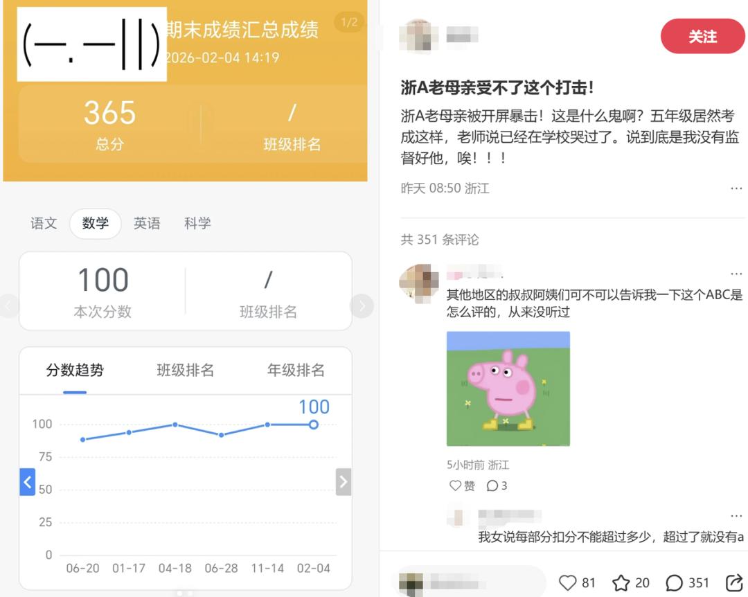 看到五年级儿子的期末成绩单,一位五年级妈妈心态崩了,在社交平台发帖称:“浙A老母亲被开屏暴击!这是什么鬼啊?五年级居然考成这样,老师说已经在学校哭过了。说到底是我没有监督好他,唉!!!”