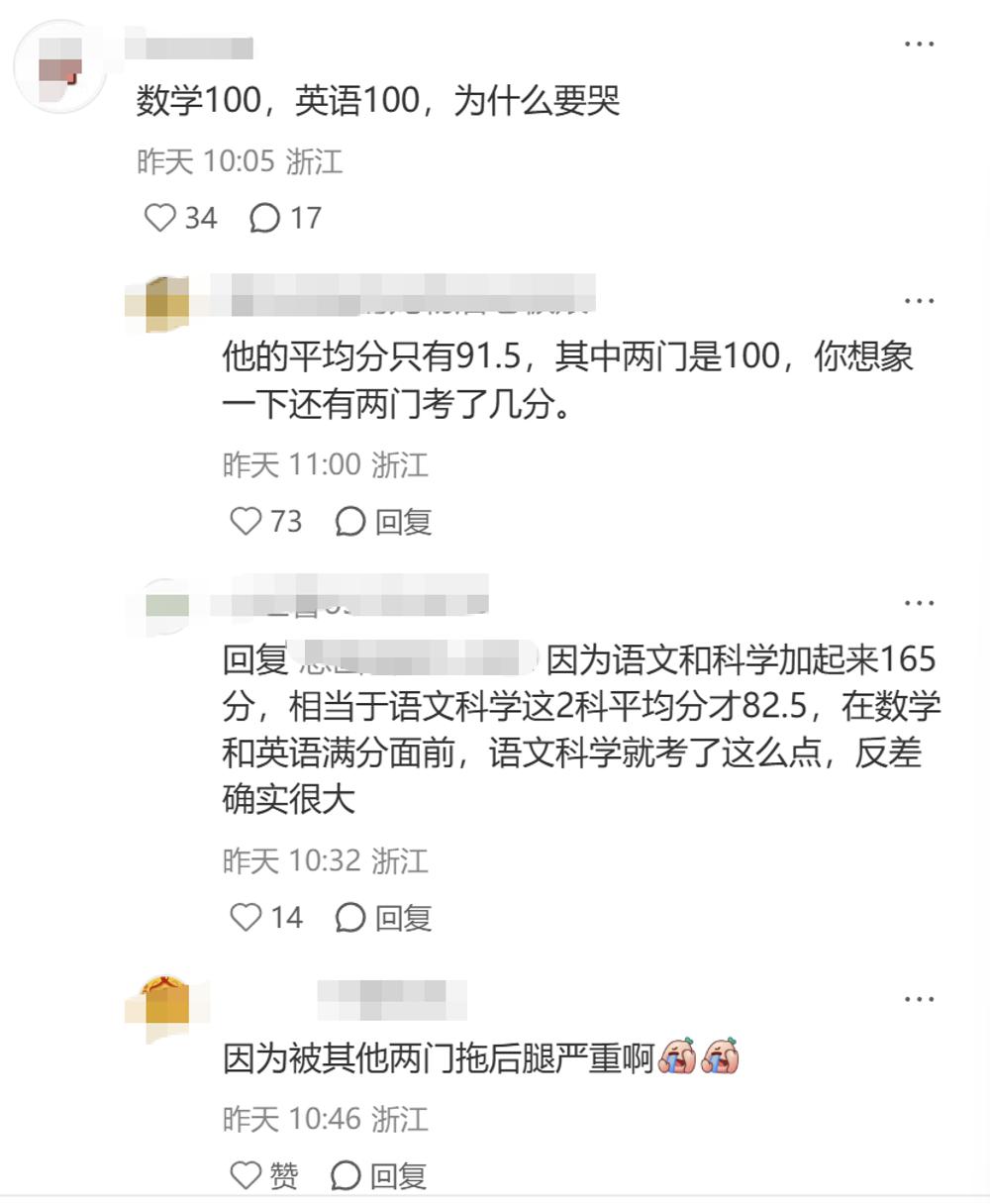 但评论区有妈妈表示,这孩子至少有两门课考了满分了,简直是“凡尔赛”,让四门课平均分只有80多的妈妈们“怎么活”。
