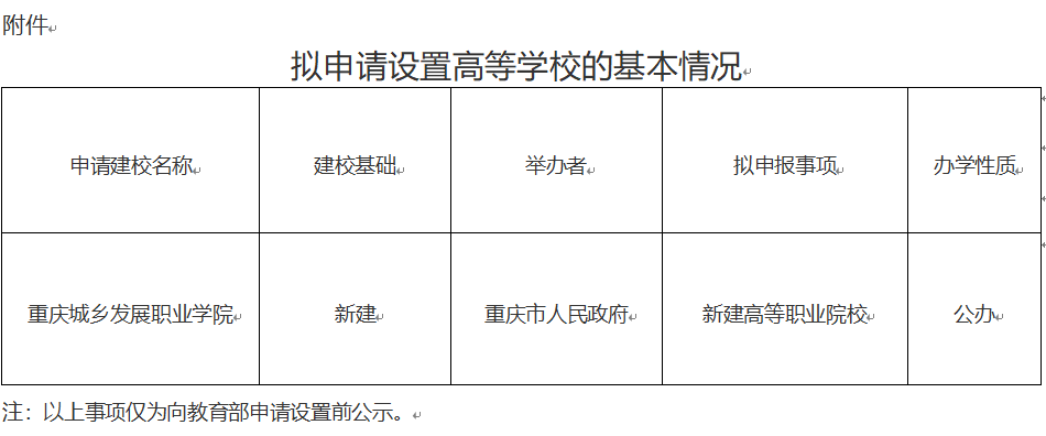 拟申请设置高等学校的基本情况显示,申请建校名称重庆城乡发展职业学院,由重庆市人民政府举办,办学性质为公办。
