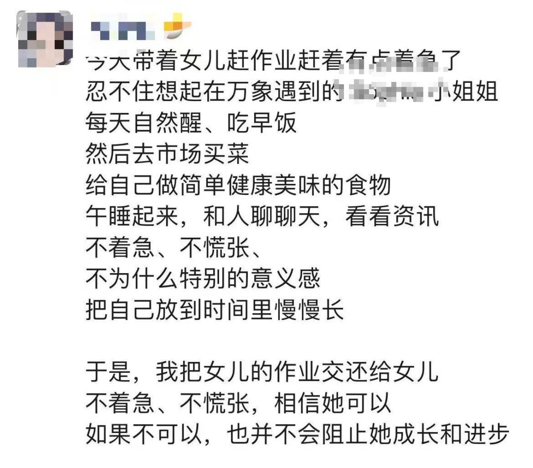 为了缓解焦虑,她和朋友聊天、和AI对话,稳住自己之后,她发了一条朋友圈:“把女儿的作业交还给女儿,不着急、不慌张,相信她可以。如果不可以,也不并不会阻止她成长和进步。”