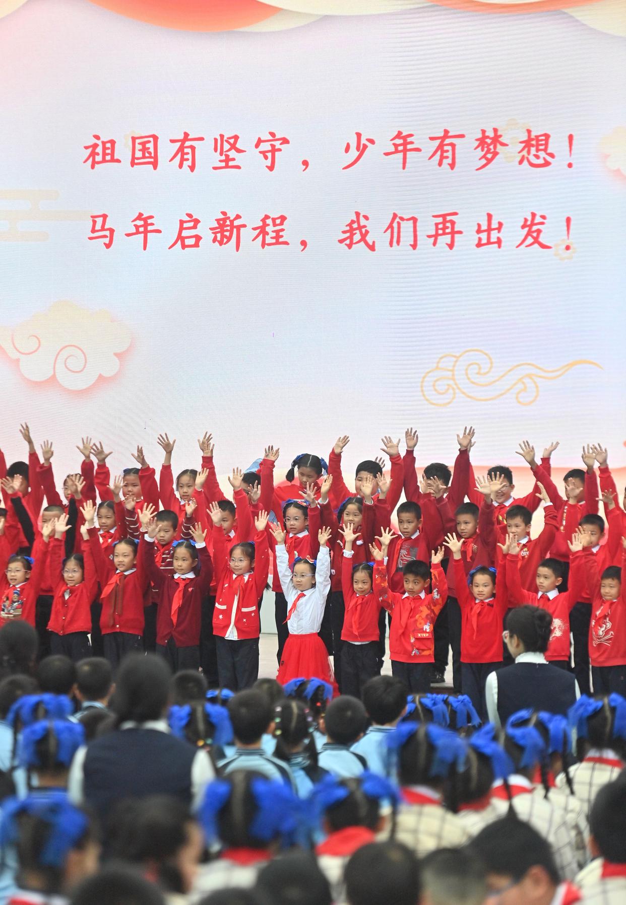 3月2日,在广西南宁市滨湖路小学,孩子们在开学典礼上朗诵诗歌。新华社记者 黄孝邦 摄