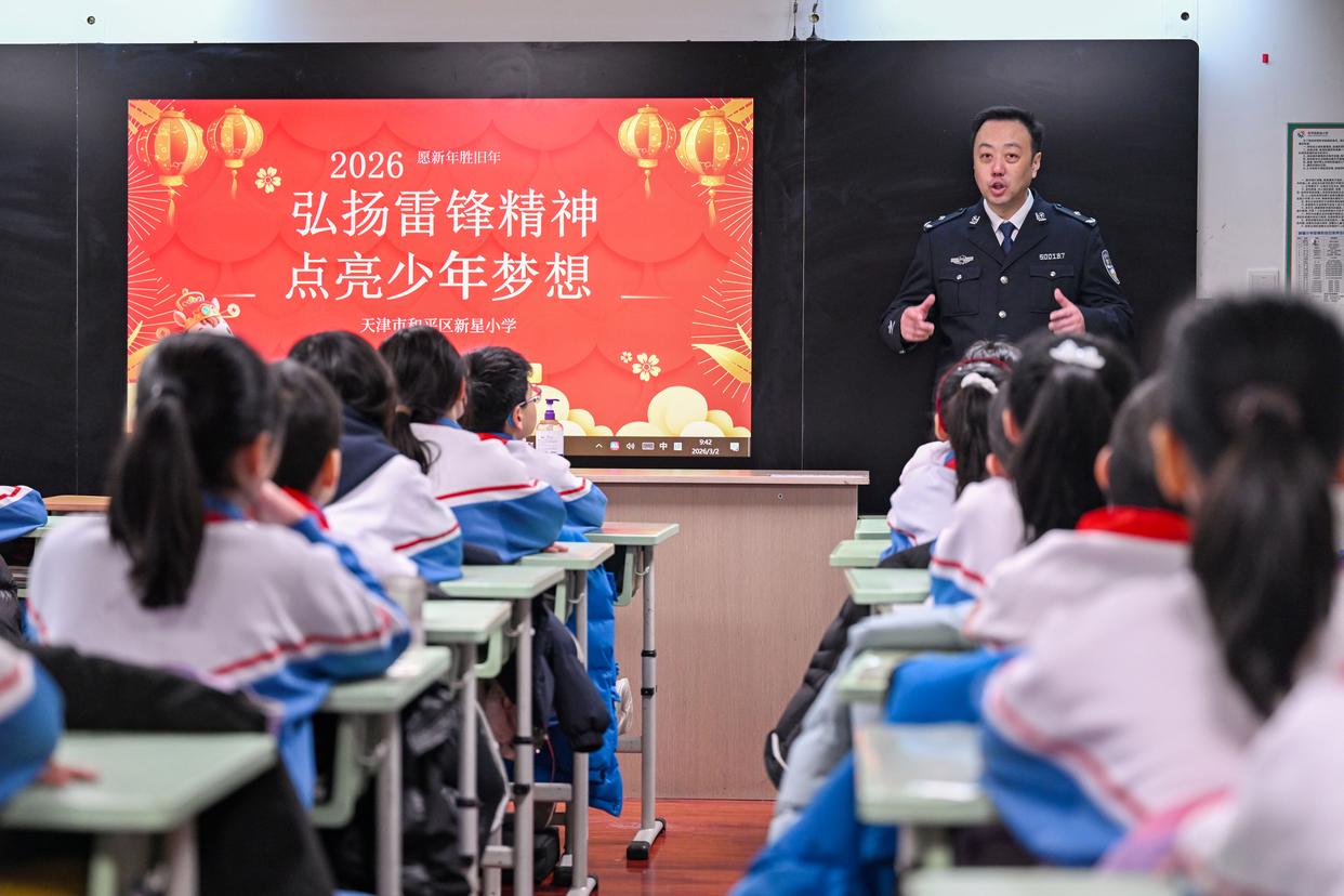 3月2日,在天津市和平区新星小学,民警在宣讲雷锋精神。新华社记者 赵子硕 摄