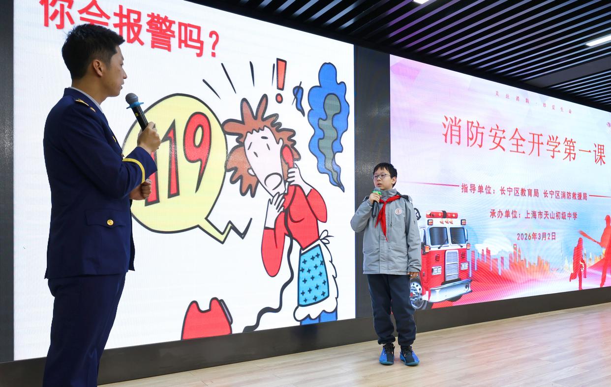3月2日,上海市长宁区消防救援局为上海市天山初级中学学生带来一堂消防安全实训课。这是消防员在课堂上与学生进行拨打119火警电话的情景演示。新华社记者 方喆摄