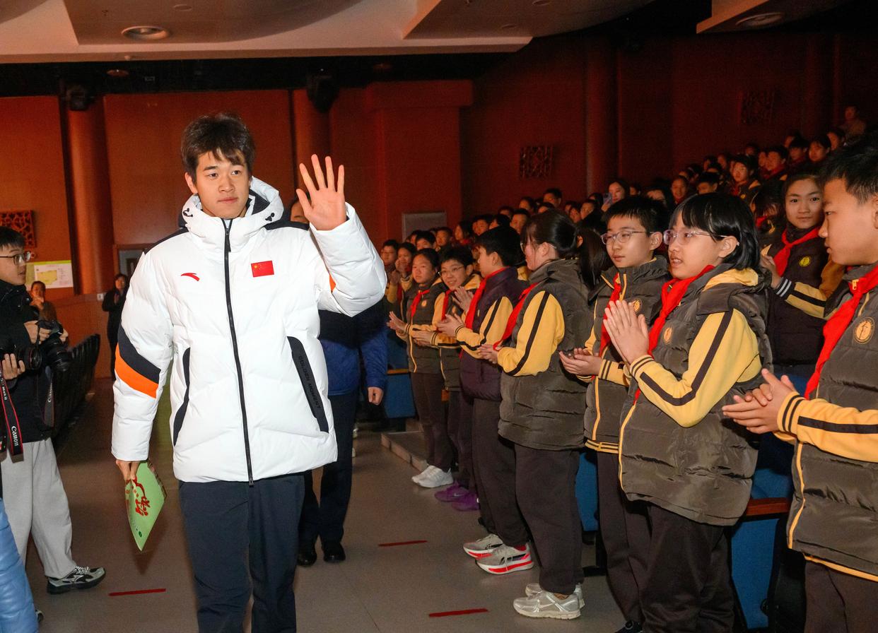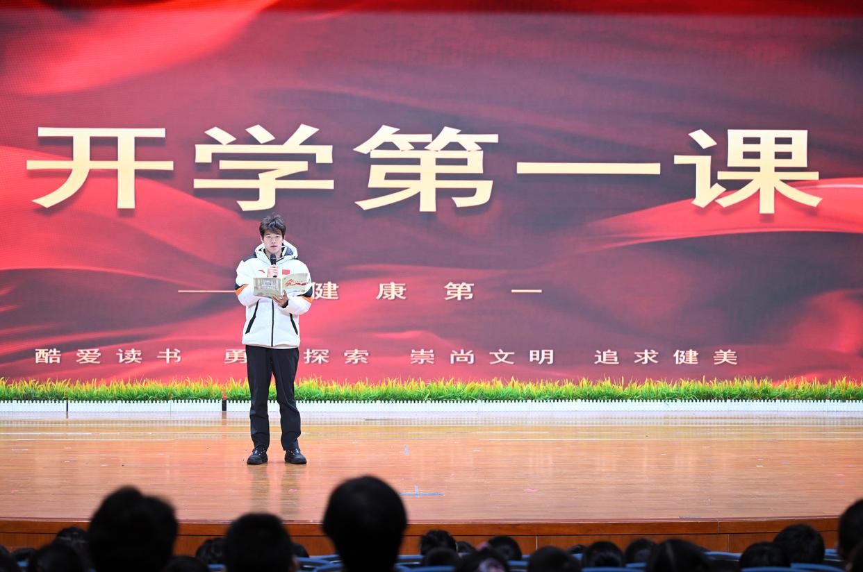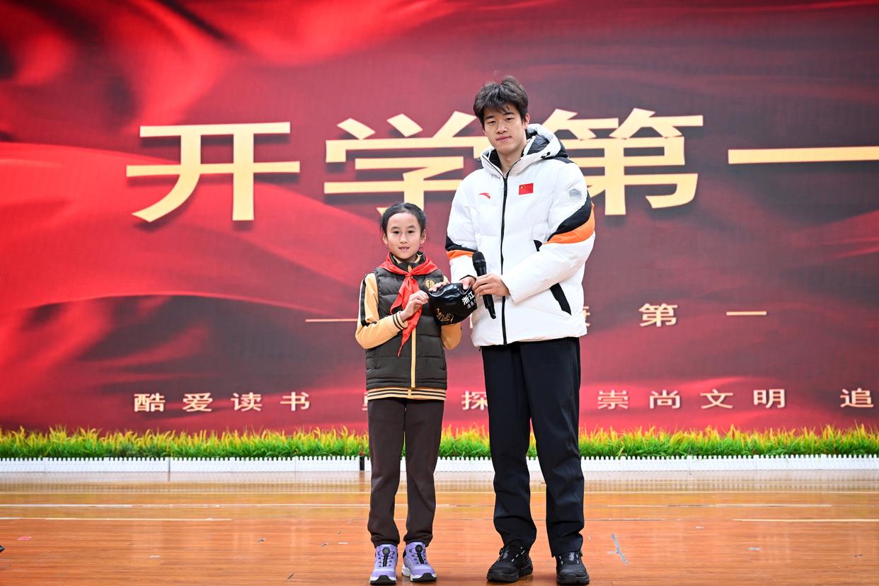3月2日,北京第二实验小学以“勤励智耕 对己负责”为主题,举行新学期开学典礼。奥运冠军潘展乐受邀走进校园,带来“身心健康”为主题的开学第一课。新华社记者 金良快 摄