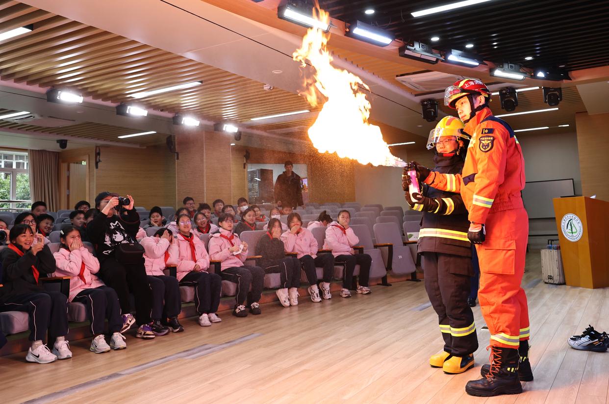3月2日,上海市长宁区消防救援局为上海市天山初级中学学生带来一堂消防安全实训课。这是消防员在课堂上指导学生认识易燃物品的危害性。新华社记者 方喆摄