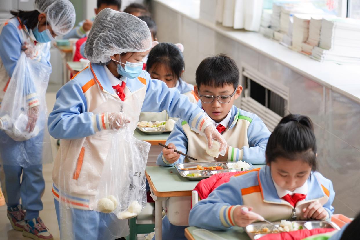 3月2日,首都师范大学附属小学三年级3班分餐员在教室分馒头。新华社记者 谢晗 摄