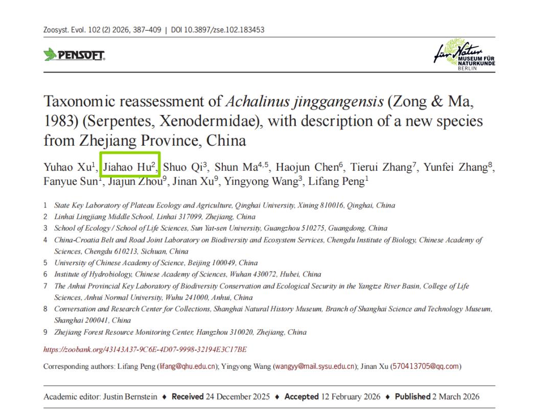 3月3日晚间,浙江临海高三学生胡家豪在朋友圈晒出了国际期刊《Zoosystematics and Evolution》新鲜出炉的一篇论文截图,论文内容是浙江临海发现的爬行动物新物种——括苍山脊蛇。