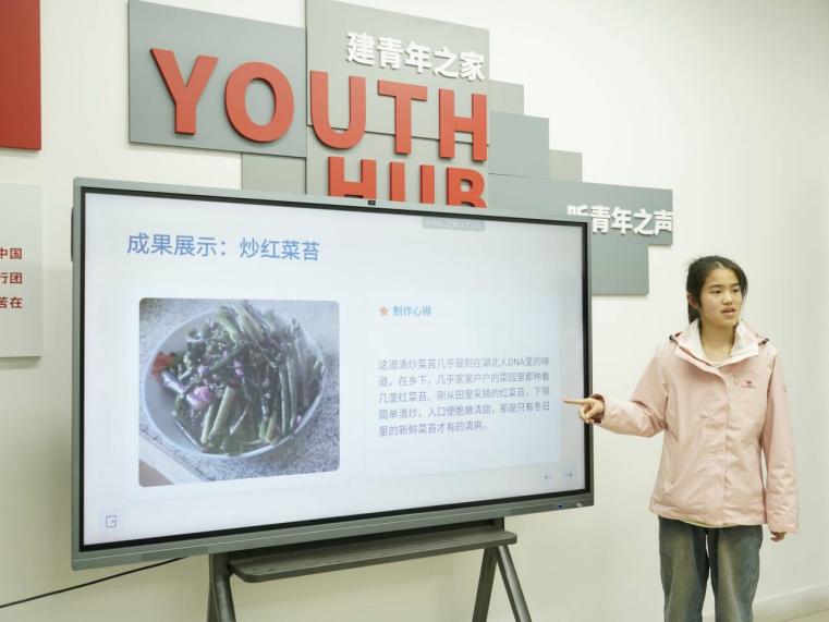 “这是湖北冬天的味道,刚从田里采的菜薹,下锅简单清炒,脆嫩清甜。那是我第一次独立完成的‘家乡味’。”3月5日下午,湖北工业大学材料与化学工程学院“一站式”学生社区内,2025级材工拔尖班的杨雨欢站在屏幕前,指着PPT上的清炒红菜苔照片,分享着她的“寒假作业”。