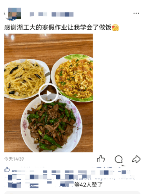 作业布置之初,辅导员王玥为零基础同学提供了番茄炒蛋、青椒肉丝等基础菜谱作为参考。然而,学生们的创作远超预期:可乐鸡翅、蘑菇鸡蛋汤、羊肚菌虾滑蒸蛋、爆炒椒盐海虾……一道道“硬菜”在学生们的镜头下惊艳亮相。有人剪辑了详细烹饪教程发班级群,有人在社交媒体晒出“处女作”,并感慨道:“感谢湖工大的寒假作业,让我解锁了新技能!”