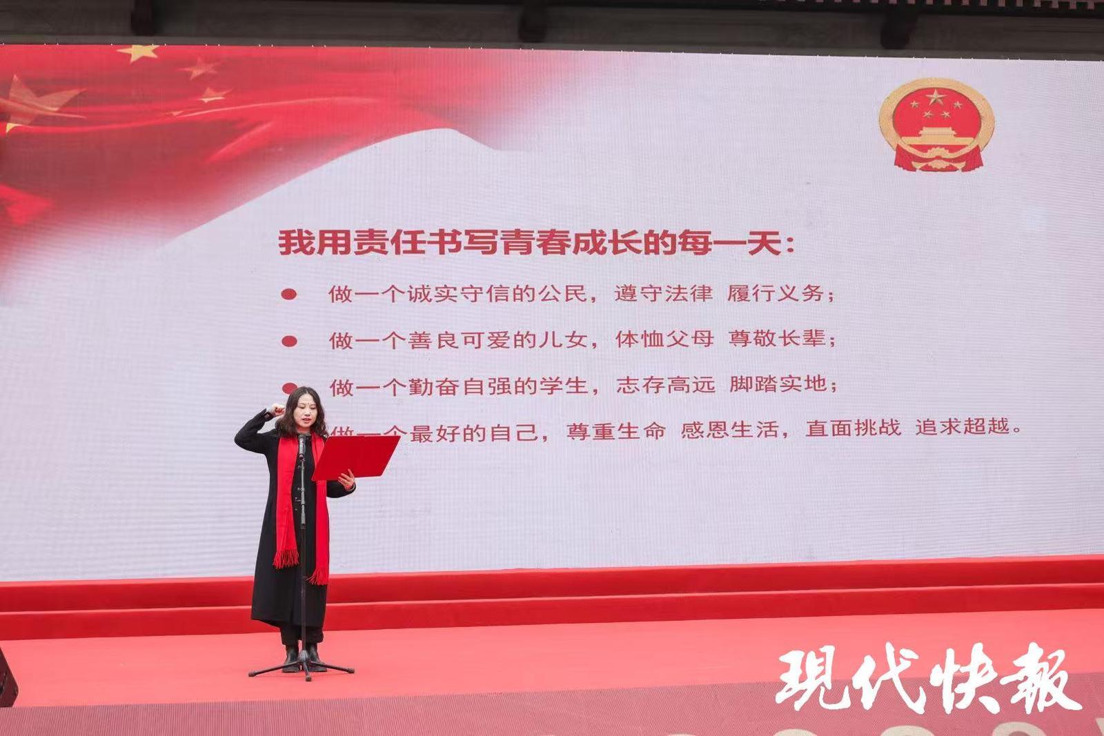 南京一中校长陈立其为学生代表佩戴成人徽章,家长为自己的孩子佩戴成人徽章。南京一中党委书记居艳领誓,全体学子许下他们的青春誓言:我用责任书写青春成长的每一天:做一个诚实守信的公民,遵守法律、履行义务;做一个善良可爱的儿女,体恤父母、尊敬长辈;做一个勤奋自强的学生,志存高远、脚踏实地;做一个最好的自己,尊重生命、感恩生活,直面挑战、追求超越……